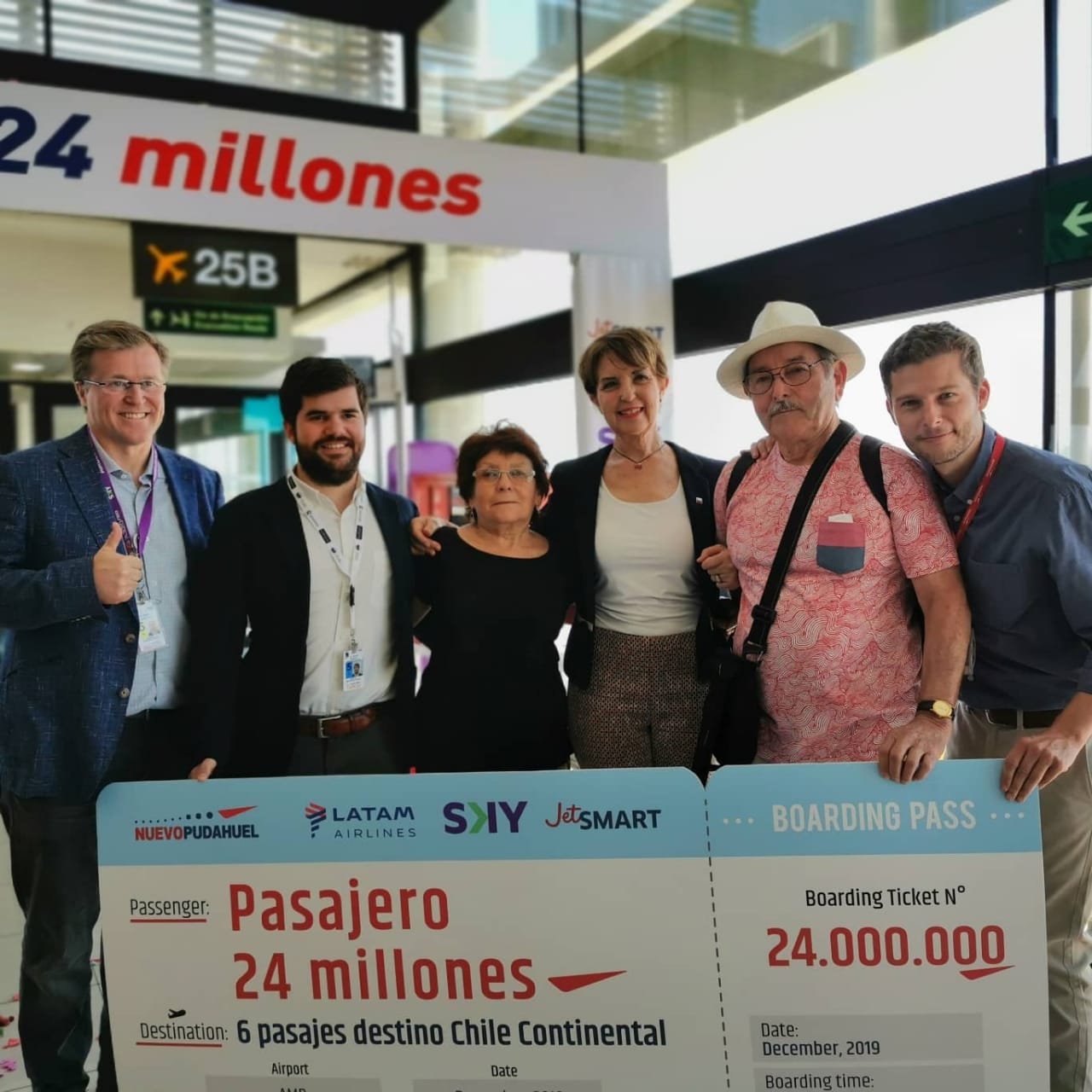 Por primera vez en la historia del Aeropuerto Internacional Arturo Merino Benítez circulan 24 millones de pasajeros en un solo año. El hito, que evidencia el gran dinamismo de la industria, fue celebrado con globos y serpentinas en el principal recinto aéreo del país. En el lugar, se premió al pasajero 24 millones. Esa persona, que viajaba desde Puerto Montt, recibió seis pasajes para cualquier destino en territorio de Chile continental.