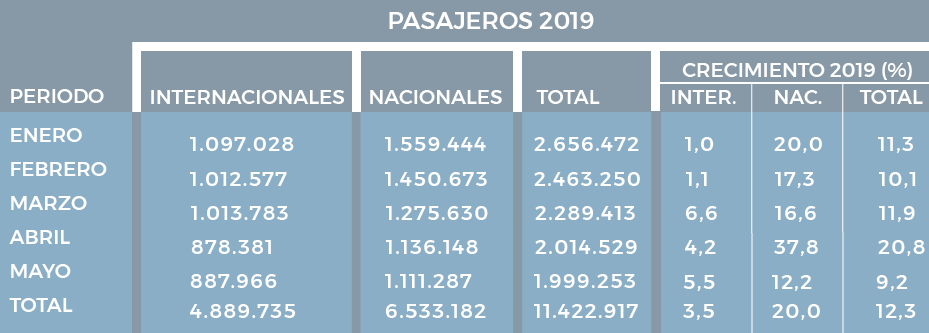 A nivel consolidado, durante mayo se transportaron 1.999.253 pasajeros en vuelos nacionales e internacionales, lo que comparado con igual periodo del año 2018 representa un aumento de 9,2%. Con estas cifras, durante los primeros cinco meses del año, se han transportado 11.422.917 pasajeros, lo que implica un crecimiento de 12,3% comparado con igual periodo del año pasado.