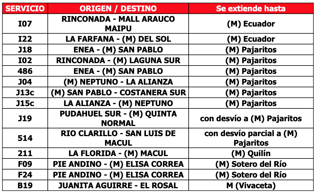 El inicio de operación de servicio de buses será partir de las 4:00 y se mantienen los refuerzos en aquellas comunas donde Metro aún mantiene estaciones cerradas. Se contará con 64 buses de apoyo distribuidos en 7 servicios y 14 extensiones de recorridos, para facilitar el traslado de los usuarios, principalmente en las comunas de Puente Alto, La Florida, La Cisterna y Maipú.